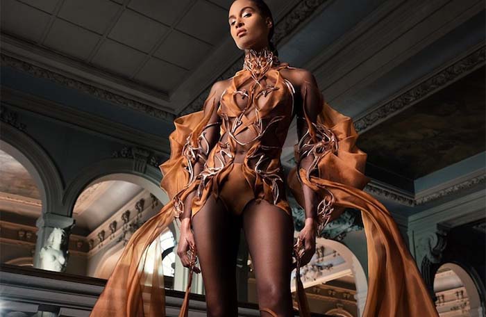 Vestido vegano de cacao en colaboración de Iris van Herpen, Magnum Ice Cream y la Universidad de Leeds