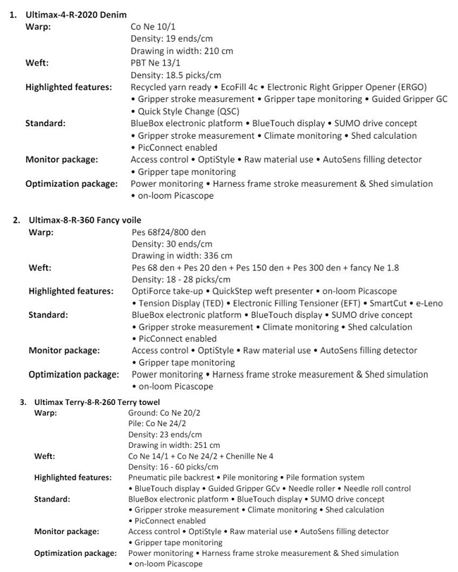 La nueva y revolucionaria máquina de tejer con pinzas de Picanol, la Ultimax, se centra en tres beneficios principales: máximo rendimiento y producción de alta calidad, preparación para los requisitos de sostenibilidad del mañana y la mayor facilidad de uso gracias a un nivel máximo de digitalización. Además, el clásico diseño exterior Picanol de la máquina se ha alterado radicalmente para dejar claro desde el exterior lo revolucionaria que es la Ultimax por dentro. Ultimax sobresale en los campos de rendimiento y calidad, ha sido diseñado teniendo como base la sostenibilidad y el alto grado de digitalización da como resultado una facilidad de uso nunca antes vista. En ITM 2024, se exhibirán tres máquinas Ultimax con diferentes movimientos de calada, diferentes anchos de máquina y una variedad de características. Una máquina tejerá tela vaquera, otra tejerá gasa y también habrá una Ultimax Terry.
