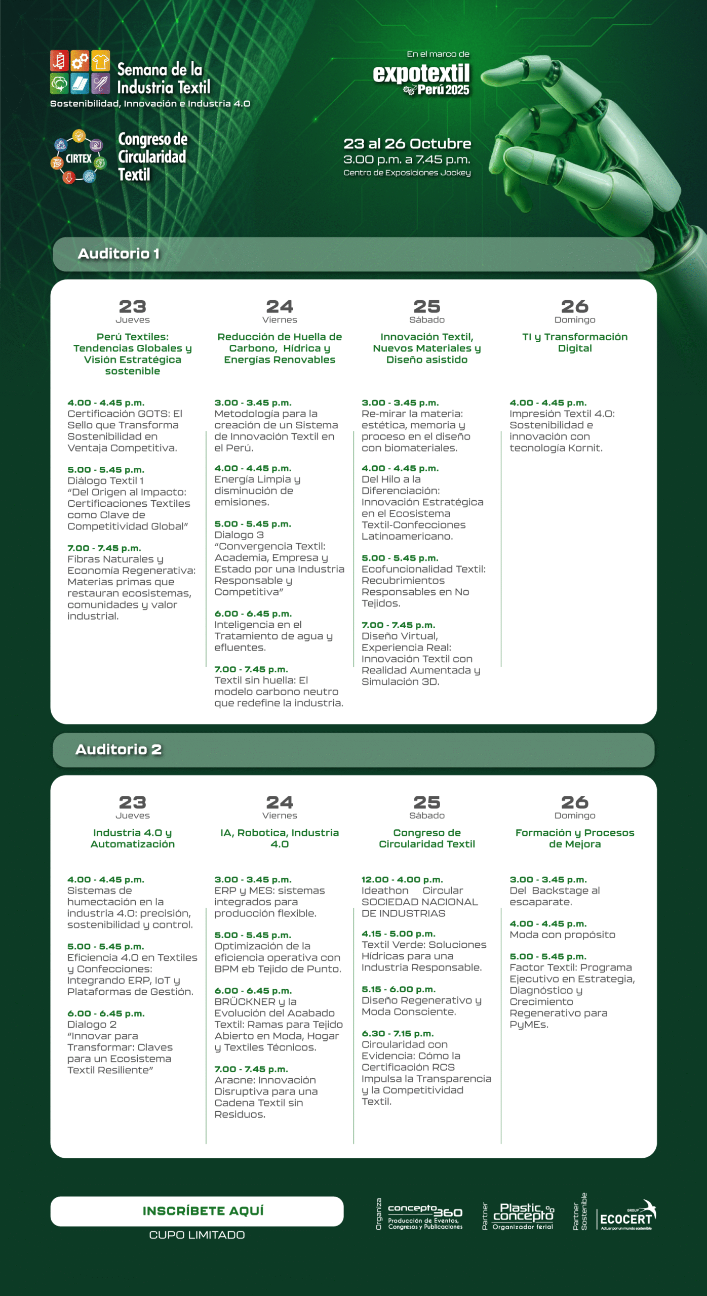 La novena edición reúne a líderes, expertos y empresas en el encuentro técnico-comercial más relevante del sector. Ofrece congresos, conferencias magistrales, talleres y networking enfocados en innovación, transformación digital y economía circular. Un espacio estratégico para impulsar la competitividad, sostenibilidad e internacionalización del ecosistema textil–confecciones del Perú.
